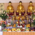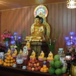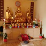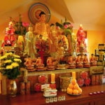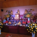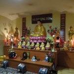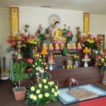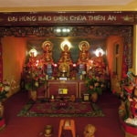 Vnitřní zařízení chrámů bývá podobné. Hlavní oltář se sochami buddhů a bódhisattvů, postranní oltář pro vyjádření úcty k zemřelým hrdinům, vůdcům a příbuzným (na fotografii z Plzně). Ovoce, sladké jídlo, balená voda, vonné tyčinky a svíce. A množství květin. Vše udržováno čerstvé a svěží. V řadách na zemi před hlavním oltářem jsou umístěny polštářky pro účastníky obřadů se zpěvem súter (hlavně Lotosové sútry a Amitábhasútry), poklonami, vzýváním Amitábhova jména a modlitbami přání a požehnání všem živým bytostem. Při meditaci se používají dva rytmické nástroje: rybí tlama a zvonící mísa. Rány do rybí tlamy určují rytmus odříkávání manter a úder do mísy je znamení pro poklonu. Na různých místech bývá napsána mantra „Utíkám se k buddhovi Amitábhovi“ (Nam Mô A Di Đà Phật); někdy zní její zpěv nepřetržitě z reproduktorů. V hlavní místnosti bývá umístěn i zvon a gong. Také všechny fotografie interiérů v následující galerii je možné zvětšit.