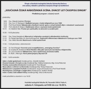 Konference „Současná česká náboženská scéna. Dvacet let časopisu Dingir“, která se koná na Husitské teologické fakultě UK, Pacovská 350/4, Praha 4, v sobotu 4. listopadu od 9:00 do cca 16:30 h. má tento předběžný časový rozvrh: