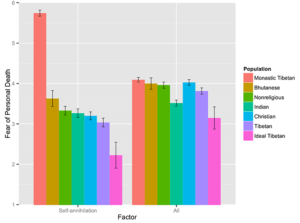 Byli proto překvapeni, že výsledek testu skládající se z několika otázek ukázal pravý opak: „K našemu překvapení tibetští buddhističtí mniši vykázali významně vyšší strach ze smrti než jakákoliv jiná skupina.“ Mniši byli např. nejméně ochotni připustit, že by v hypotetické situaci zkrátili o půl roku svůj život, i kdyby tím jinému pomohli prodloužit jeho život o pět let: Výrazná většina (72 %) uvedla, že by to neudělala.