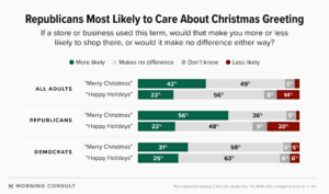 Podle analýzy průzkumu, který na začátku listopadu provedla americká agentura „Morning Consult“ mezi více než dvěma tisíci dospělých Američanů, by 56 % republikánů spíše nakupovalo v obchodech, v nichž se setkají s přáním „Radostné Vánoce!“ („Merry Christmas“). V obchodech, které jim přejí „Šťastné svátky!“, by 20 % republikánů spíše nenakupovalo. Jak je také vidět na přiloženém grafu (je možné ho zvětšit), demokraté mají naproti tomu rozdíl v preferencích obou pozdravů daleko méně dramatický a nejvíce z nich na formě přání ani nezáleží.