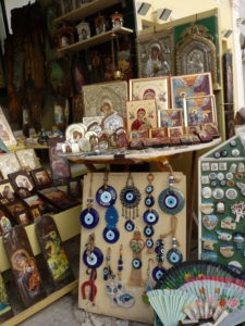 Fotografie z ostrova Tinos, jednoho z nejvýznamnějších poutních míst v zemi. Poutníci z celého světa se sem sjíždějí, aby uctili ikonu Zvěstování přesvaté Bohorodici, která je považována za divotvornou. Ulice hlavního města jsou lemovány stánky, v nichž jsou kromě tradičních pravoslavných předmětů nabízeny také amulety, jejichž kořeny sahají do předkřesťanských dob. Jde o takzvané nazary, v Řecku nazývané matochandra, které mají chránit před „zlým okem“, tedy uhranutím.