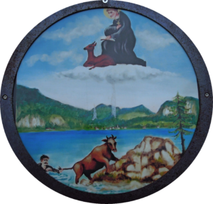Na fotografiích, jimiž připomínáme prázdninovou soutěž (více zde), je kaplička na jezeře a vymalovaný výjev (je možné ho zvětšit) dobrodružství řezníka s volem – pod laskavým dohledem svatého Jiljí, jemuž je zasvěcen kostel v Sankt Gilgenu a jehož jméno (v jedné z německých variant) vesnice v pozadí nese.
