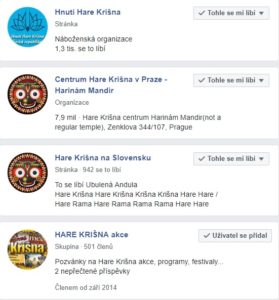 Centrem virtuálního života oddaných se v posledních třech až pěti letech stala sociální síť Facebook. Některé komunity dokonce zcela zrušily své webové stránky a prezentují se pouze zde. Mimo komunitních facebookových stránek jednotlivých center hnutí a Mezinárodní společnosti pro vědomí Krišny v České republice jako celku zde vzniklo i mnoho dalších stránek a diskusních skupin, které jsou tematicky zaměřené. Samostatná skupina se zaměřuje na otázky a odpovědi související s věroukou texty, ale i životním stylem, výchovou dětí nebo vztahy. Najdeme zde skupiny, jejichž ústředním tématem je vaření a vegetariánské stravování, ochrana krav či indické oděvy, ozdoby nebo líčení. Svou facebookovou prezentaci má Dětský spolek Dváraka, který připravuje program a výuku pro děti oddaných, každá jednotlivá vegetariánská restaurace a mnoho dalších aktivit pro členy i zájemce o hnutí Haré Kršna. Také akce, festivaly a další události se v současnosti inzerují nejvíce právě prostřednictvím Facebooku.