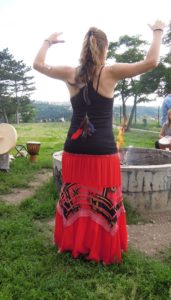 Ve slunečném podvečeru se přicházející účastníci zdravili (obvykle objetím) a brzy vyráželi do blízkého lesíka pro dřevo. Bylo také potřeba nanosit z auta k ohništi bubny a další rytmické nástroje. Pak byl na ohništi z betonových obručí zapálen posvátný oheň, jímž – podle trochu slavnostně pronesených slov zapalující účastnice – budou uctěni naši předkové a do nějž bude moci být odhozeno vše, co je spojené s minulou etapou našich životů. Po krátkém představení všech příchozích (jméno plus sdělení, jak se cítíme) se začalo bubnovat. Opravdu spontánně, ale jednotliví bubnující se navzájem brzy přizpůsobili, takže rytmus byl nakonec jednotný a zvuk mohl poskytnout i pozoruhodně silný zážitek. Dvě mladé ženy tančily kolem ohně. Místy zazněl i zpěv a v jednu chvíli začala jedna z účastnic hrát na flétnu (také asi spontánně) a bubnování jí postupně dalo přednost.