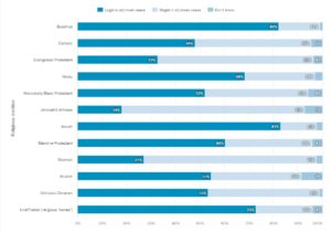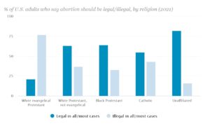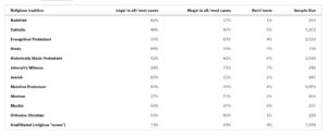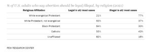 Přehled výsledků průzkumu postojů Američanů k otázce potratů podle náboženských tradic (Pew Research Centre, 2021):