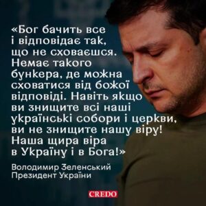 Zelenskyj není při jakémkoliv náboženském projevu v úplně jednoduché pozici.[3] Náboženství totiž nikdy nebylo jeho výrazným tématem, což je zřejmě mimo jiné zapříčiněno jeho židovským původem. On sám se ke své osobní víře vyjadřuje jen sporadicky. Útok na katedrálu v Charkově však využil (nutno dodat umně) i k náboženské mobilizaci své země. Z počátku projevu zdůraznil kulturní význam katedrály pro celou Ukrajinu a dodal, že byla využívána jako úkryt pro všechny – věřící i nevěřící. Jde o posvátné místo, kde všichni jsou si rovni. Zelenskyj dále naznačil, že útokem na tento chrám si ruští útočnici proti sobě obrátili boží nepřízeň. Doslova řekl: „On vidí, on odpovídá. Není žádný bunkr, ve kterém byste byli schopni utéct boží odpovědi.“. Dále dodal: „A i když zničíte všechny katedrály a všechny kostely, tak nezničíte naší upřímnou víru v boha, v Ukrajinu“. Touto větou Zelenskyj implicitně naznačil hned několik věcí, které by pozornému posluchači neměli uniknout. V první řadě zde hovořil jen o kostelech a katedrálách, nikoliv o jiných sakrálních objektech. Přijímá tak, že tato křesťanská posvátná místa mají pro celou zemi, stejně tak i pro něj, zásadní duchovní význam. Nezříká se zde svého židovského původu, ale naznačuje že křesťanská pravoslavná místa (potažmo křesťanství jako takové) se i jeho osobně týkají. Ještě důležitější je potom druhá část zmíněné věty z projevu. Víru v boha spojuje v jedné myšlenkové linii s vírou v Ukrajinu. Tedy zde jasně zdůrazňuje, že není pochyb o tom, že bůh je v tomto konfliktu na straně Ukrajinců. Zelenskyj také velmi schopně implicitně propojuje víru, která je nezlomná, s chutí bránit svou zem, jež se rovněž nedá ničím udolat. Tuto část projevu ukončil slovy: „Nezapomeneme na ty, kteří zemřeli, a stejně tak je nezapomene ani bůh.“ Zde ukrajinský prezident vyjádřil přesvědčení, že nejenom obrana jeho země je v souladu s boží přízní, ale také zdůraznil, že je čeká v případě pádu boží odměna. Vždyť bůh má ve své paměti to, co učinili pro svou vlast.