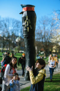 Autoři akce – sdružení Sametové posvícení – jsou v české veřejnosti známí spíše svým satirickým průvodem v obřích maskách, které defiluje Prahou 17. 11. (psali jsme ZDE a ZDE). Už v minulosti zdařile karikovali mnohé palčivé společenské problémy (domácí násilí, nehumánní zacházení s hospodářskými zvířaty, klimatická krize), ale i postavy české politické a veřejné scény (např. Zemana, Babiše nebo Duku, viz ZDE). V tomto smyslu je vynášení Morany akcí mladší i komornější. Přesto se autorský rukopis jejich tvůrců nezapře, a tak byl starý pohanský zvyk vynášení smrti a vítání jara nejen originálně výtvarně zpracován, zároveň ale tematizoval i aktuální politické a občanské dění. To se odrazilo např. v přidání nových slok k lidové písni („Morano, Morano, za co jsi umřela? Za všechno CO2, co je kvůli tobě!“).