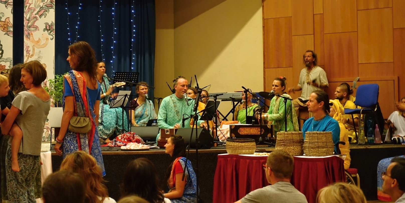 Přicházím do hlavní místnosti kongresového centra TOP hotelu v Praze, které je zdobeno červeným kobercem s květinovými symboly. Je to stejná místnost, v níž 25. března 2022 vystoupil indický vizionář Sadhguru s projektem „Zachraňme půdu“ („Save the soil“, psali jsme o tom zde). Do nosu mi přivane nespočet orientálních vůní, z nichž nejvíce výrazná je esence růže a santalového dřeva. V místnosti se shlukuje stále více lidí, mnozí mají na čele vaišnavský tilak (zlatý symbol ve tvaru V s červenou čárkou uprostřed), tradiční indické oblečení sárí, dhótí a dřevěné tulsí korálky na krku. Někteří z účastníků působí, že na podobné setkání přišli úplně poprvé, se zájmem a pokorou, a další jsou následovníci či oddaní mnoho let.
