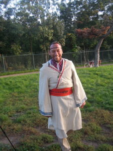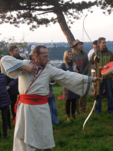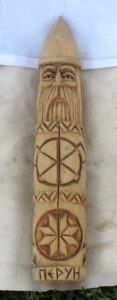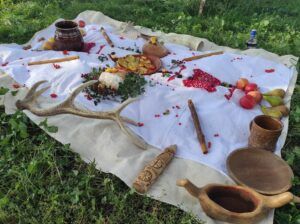 Oltář tentokrát nebyl tak bohatý jako například při slunovratu (viz zde), ale stejně vkusný. Dominovaly mu kulaté pecny chleba, misky s moukou a pečené placky, obětované jako dary vděčnosti za úrodu, džbán s vodou, nádoby s medovinou a mnohé další. Na bílé podložce ležela i vyřezávaná soška Peruna, vládce blesků, mocného božstva Slovanů. To vše bylo doplněno přírodninami: kuličkami hlohu a jeřabiny nebo kousky mechu. Do země u oltáře byly zapíchnuty Perunovy sekerky, tedy hole, které běžně asociují Jánošíka a lidový folklor, ale které starým Slovanům prý sloužili i jako zbraň. Tvrdil to Zdeněk Ordelt, novodobý slovanský žrec a hlavní představitel spolku Slovanský kruh a náboženské společnosti Slované (více o ní zde). U oltáře byla také připravena Perunova hůl: silná dubová větev, která byla prý odlomena bleskem, a která tedy nese Perunovu moc. O strom byl opřen moderní sportovní luk, který později sloužil k věštění.