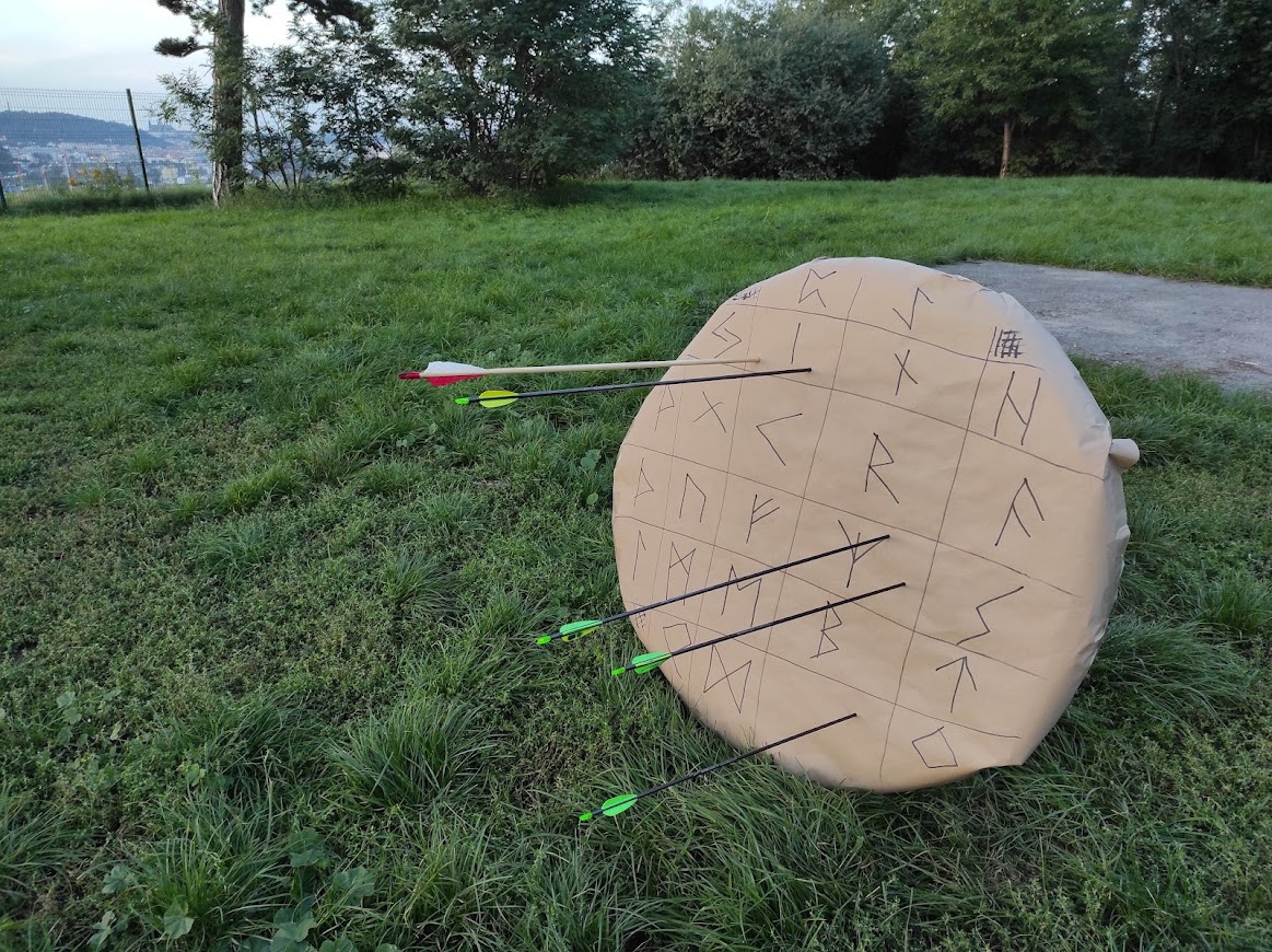 Oltář tentokrát nebyl tak bohatý jako například při slunovratu (viz zde), ale stejně vkusný. Dominovaly mu kulaté pecny chleba, misky s moukou a pečené placky, obětované jako dary vděčnosti za úrodu, džbán s vodou, nádoby s medovinou a mnohé další. Na bílé podložce ležela i vyřezávaná soška Peruna, vládce blesků, mocného božstva Slovanů. To vše bylo doplněno přírodninami: kuličkami hlohu a jeřabiny nebo kousky mechu. Do země u oltáře byly zapíchnuty Perunovy sekerky, tedy hole, které běžně asociují Jánošíka a lidový folklor, ale které starým Slovanům prý sloužili i jako zbraň. Tvrdil to Zdeněk Ordelt, novodobý slovanský žrec a hlavní představitel spolku Slovanský kruh a náboženské společnosti Slované (více o ní zde). U oltáře byla také připravena Perunova hůl: silná dubová větev, která byla prý odlomena bleskem, a která tedy nese Perunovu moc. O strom byl opřen moderní sportovní luk, který později sloužil k věštění.