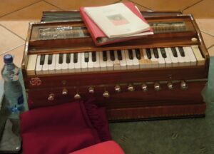 Praktikujících je v tento čtvrtek asi dvanáct. Muži a ženy sedí v kapli odděleně. Začíná se trojím zpěvem „óm“ a zazní několik málo slov na úvod. Po Gájatrí mantře, jejíž text se nachází již v Rgvédu mezi hymny nejstaršího období indické literatury, se už začínají zpívat bhadžany (písně lásky a oddanosti k Bohu, který je uctíván pod různými jmény a formami) podle pořadí vyznačeného na listech visících ze stolu. Zpívá se například: