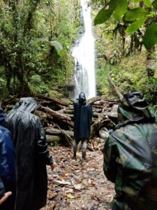 Cesta to byla skutečně náročná a nabuzení kokou přišlo vhod, protože celá trvala minimálně osm hodin, prudce pršelo a velmi často se šlo buď prudce nahoru do kopce nebo se scházelo prudce dolů. Čas jako by se zastavil a vůbec neutíkal, protože se pořád zastavovalo a čekalo na ostatní. Těsně před vodopádem, když jsme ho z pralesa ještě neviděli, ale už slyšeli, si Roman podřepl a asi deset minut rozjímal, než nám dal pokyn, že můžeme dál. Přímo před vodopádem vykonal několik obřadů: okuřoval nás tabákem, společně jsme stáli čelem k vodopádu a měli se k němu pomodlit a v duchu přednést své záměry, na kámen před vodopád se jako obětina položily různé druhy ovoce, vykuřovadlo, krystal a doutník. Roman nám řekl, že jsme právě vstoupili do „přírodního chrámu Matky Země a Otce Stvořitele“. Kdo chtěl mohl se jít nahý vykoupat.