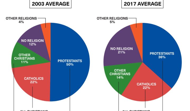 Co se religiozity týče, umírněně věřící mají tyto zkušenosti častěji než ti, kteří patří do skupiny velmi věřících, nebo naopak mezi ty, kteří náboženskou víru nepraktikují. Přítomnost zemřelého za posledních dvanáct měsíců v nějaké podobě zakusilo 58 % katolíků, 56 % příslušníků historicky černošské protestantské tradice, 52 % příslušníků tradičních protestantských denominací a 35 % evangelikálů, ale i každý pátý agnostik a šestina těch, kteří se považují za ateisty.