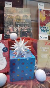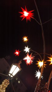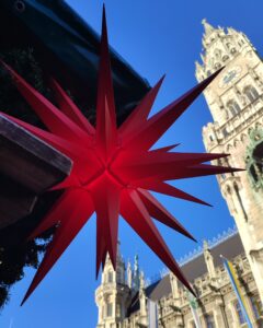 Fotografie: Ochranovské hvězdy jako součást městské výzdoby v Mnichově, hlavním městě tradičně katolického Bavorska, 18. 12. 2023, Jitka Schlichtsová.