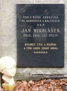 „Zde v Pánu odpočívá po radostech a bolestech pan Jan Mikolášek, úřední znalec léčivých bylin. Bylinky ctil a miloval a těmi lidem zdraví dával. Vavrenka“