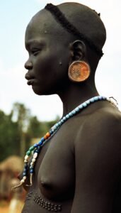 U Mursiů se také stále můžeme setkat s deformováním hlavy, jakýmsi zužováním či zmenšováním lebky směrem do temene. Tento zvyk je doložen již v nejstarších dochovaných textech starověkého Egypta – tam šlo o protahování lebky – a patrně byl aplikován po celém povodí Nilu až k oblasti údolí Omo.[21] Mezi významné egyptské vládce zobrazované s takto protáhlou lebkou patří Achnaton a Nefertiti. Tato deformace se u Mursiů opticky umocňuje linií z vlasů, jak dokládám na jedné z fotografií. Podobnou tělesnou modifikaci prováděla rovněž některá jihoamerická etnika. U Mursiů jsem nepozoroval přímo protažené lebky, ale zmenšené temenní části lebek, přičemž reálné zmenšení bylo ještě vizuálně zvýrazňováno pruhem vlasů na místě přechodu. Důvod této tělesné modifikace se mi nepodařilo mezi Mursii zjistit ani za pomoci překladatele. Zdá se, že sami Mursiové zmenšovaní hlavy v temeni chápou jako modifikaci estetickou, spíše než nábožensky motivovanou.