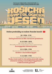 Centrum pre religionistiku a historické štúdiá, n.o. pripravilo siedmy ročník úspešného cyklu prednášok „Košická egyptologická jeseň“. Cyklus sa zameriava na odkrývanie tajomstiev starovekého Egypta a ponúka hlboký pohľad do jeho kultúry, histórie a archeologických objavov prostredníctvom série odborných prednášok. Tohtoročné prednášky prinesú nové poznatky a fascinujúce témy, ktoré obohatia naše chápanie tejto starobylej civilizácie. Bližšie informácie o jednotlivých prednáškach nájdete vo zverejnenom harmonograme: