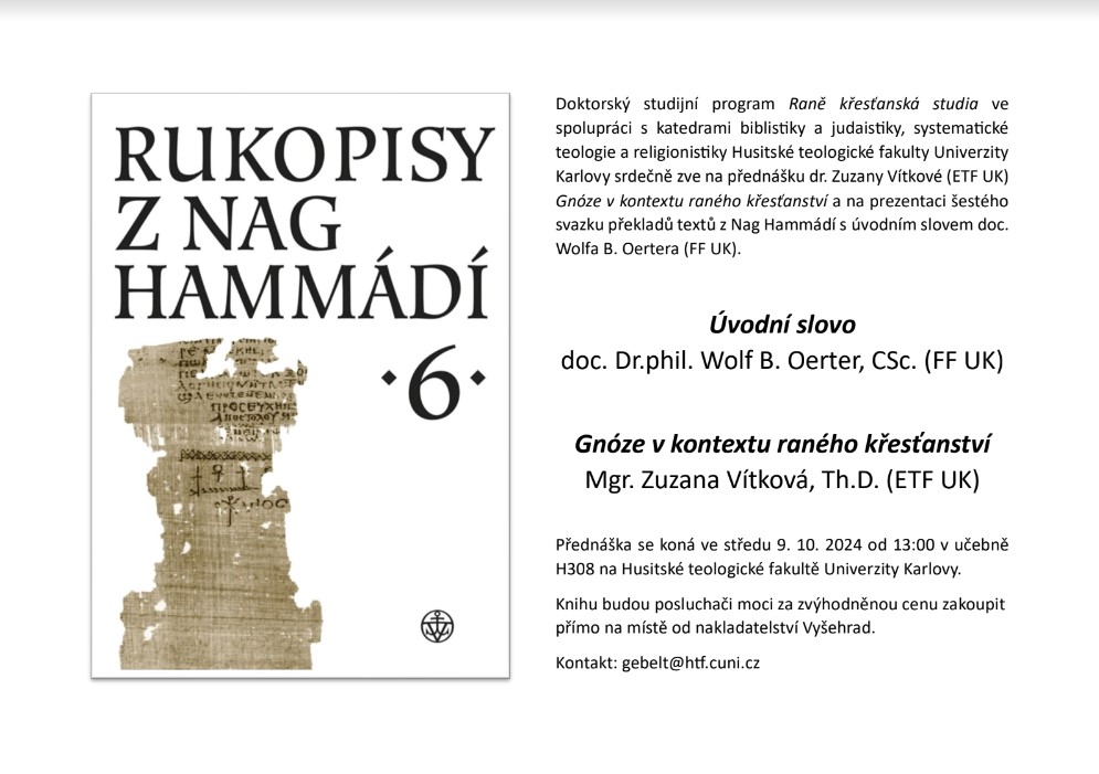 Součástí přednášky bude též prezentace šestého svazku překladů textů z Nag Hammádí. Kniha bude na místě k zakoupení za zvýhodněnou cenu přímo od nakladatelství Vyšehrad. Přednáška se koná 9. 10. 2024 od 13:00 v učebně H308. Další informace zde.