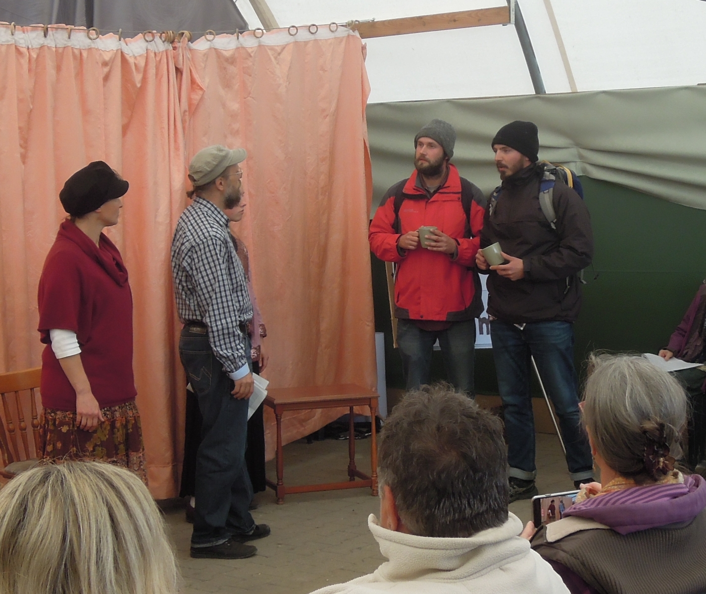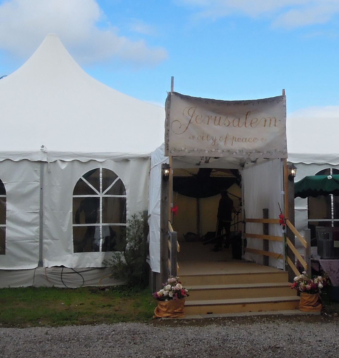 3. Účastníci si sedají do řad v „malém stanu“, čelem k pódiu. Jonathan v roli Krále Jašuy rozmlouvá s andělem Gabrielem o tom, co začalo v Sus v roce 2010.