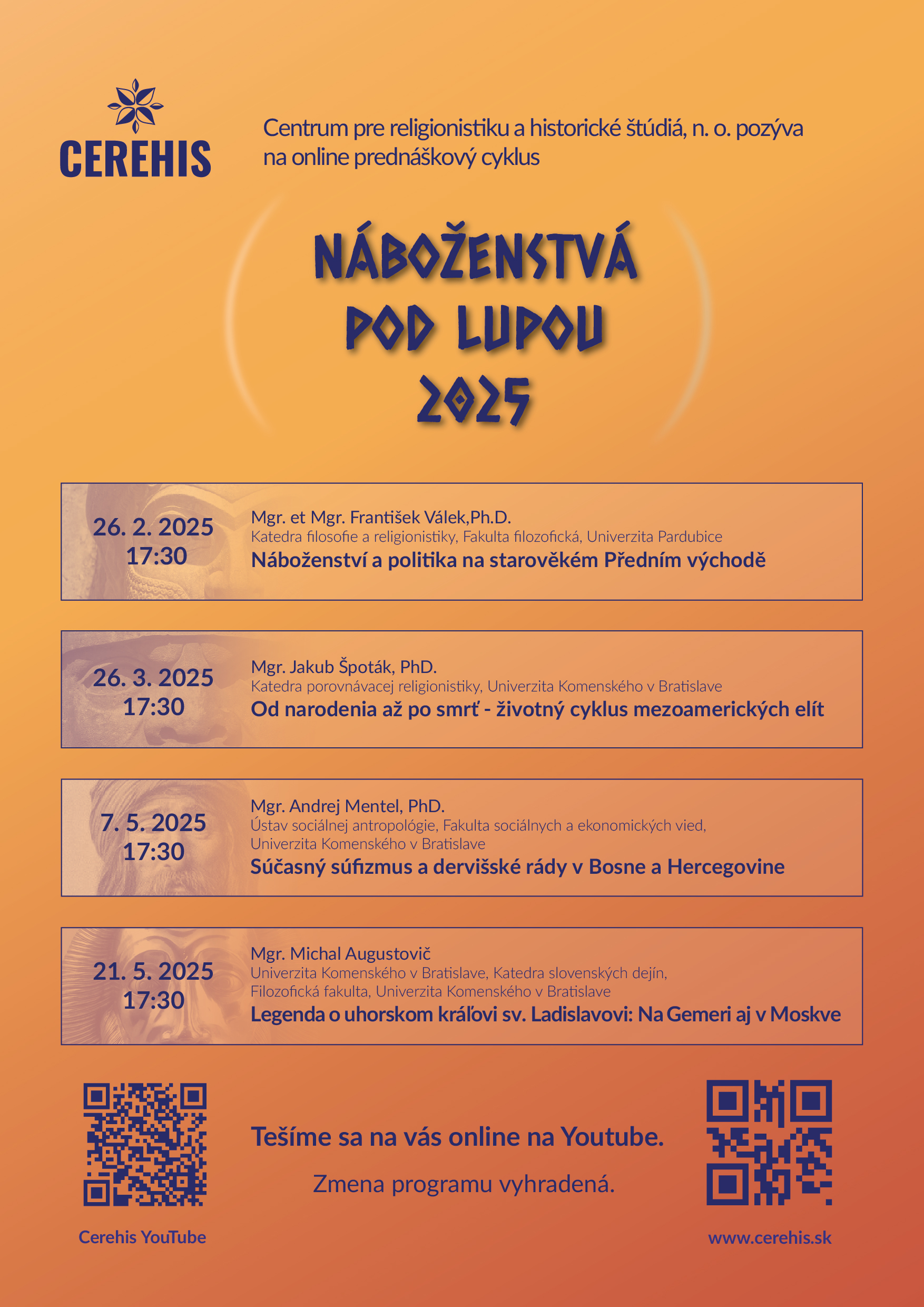 Centrum pre religionistiku a historické štúdiá, n. o. (CEREHIS) vás srdečne pozýva na 7. ročník prednáškového cyklu „Náboženstvá pod lupou,“ ktorý aj v roku 2025 prinesie sériu prednášok o náboženstvách, kultúrach a dejinách v rôznych historických i súčasných kontextoch. Tento rok vás čakajú podnetné a pútavé témy – od náboženstva a politiky na starovekom Blízkom východe, cez život mezoamerických elít, až po súčasný súfizmus v Bosne a Hercegovine.