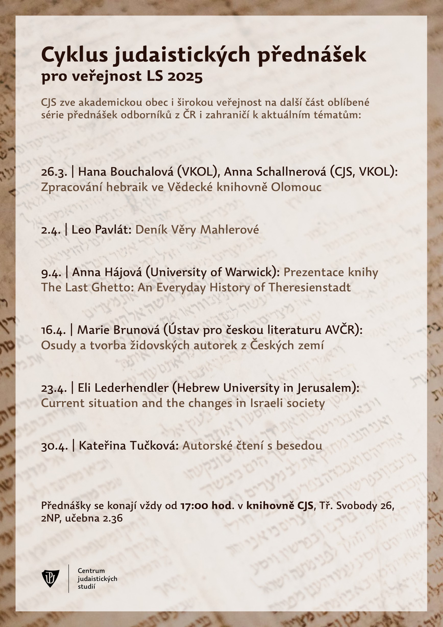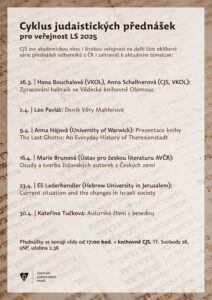 Centrum judaistických studií Kurta a Ursuly Schubertových Univerzity Palackého v Olomouci zve všechny zájemce na tradiční Cyklus judaistických přednášek pro veřejnost, které se budou konat každou středu od 26. března do 30. dubna 2025. Přednášky se konají od 17:00 v knihovně CJS na Tř. Svobody 26, učebna 2.36 v druhém nadzemním patře. Vítáni jsou studenti univerzity i široká veřejnost-. Mohou se těšit na zajímavá témata českých i zahraničních odborníků v oblastech židovské víry, historie nebo kultury.