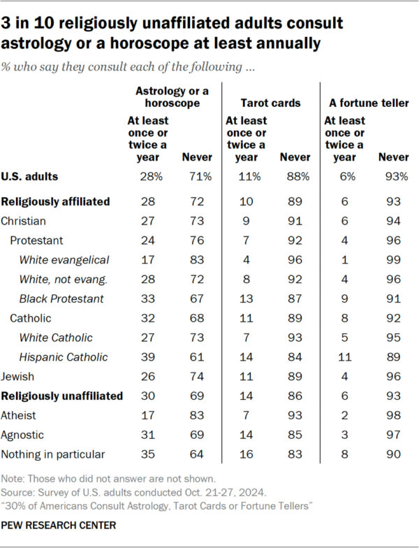 Z náboženských skupin pak horoskopům nejvíce důvěřují hispánští katolíci, černí protestanti a ti, kteří své náboženství nijak konkrétně nedefinují („nothing in particular“). Lidé z těchto skupin také nejčastěji uvádějí, že konzultace s tarotovými kartami, horoskopem nebo věštcem pro ně byla přínosná. Astrologii naopak nedůvěřují ateisté a bílí evangelikální protestanti.