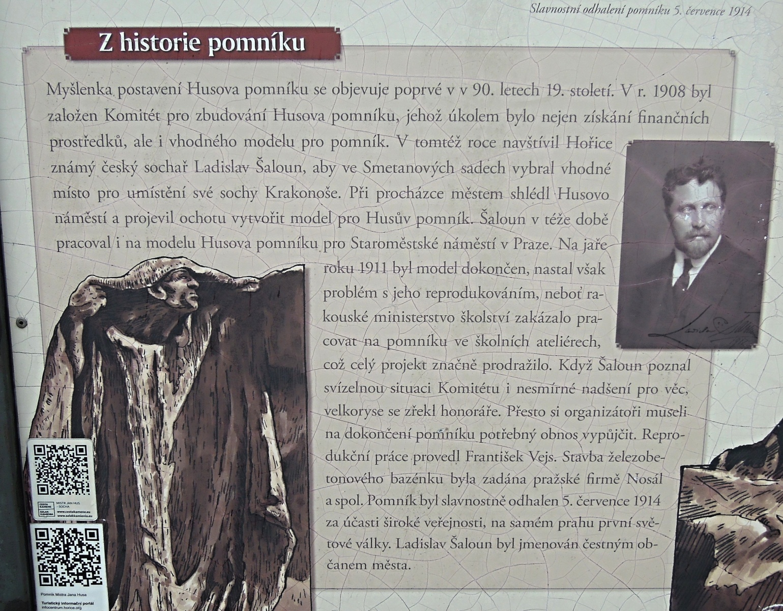 Zítřejší 610. výročí popravy Jana Husa († 6. července 1415) bude zároveň 510. výročím slavnostního odhalení jeho sochy na Staroměstském náměstí v Praze. Autor mohutného pražského sousoší, Ladislav Šaloun (1870–1946), vytvořil ale návrh podobně monumentálního Husova pomníku, který byl slavnostně odhalen už o rok dříve, 5. července 1914, a to v Hořicích v Podkrkonoší.