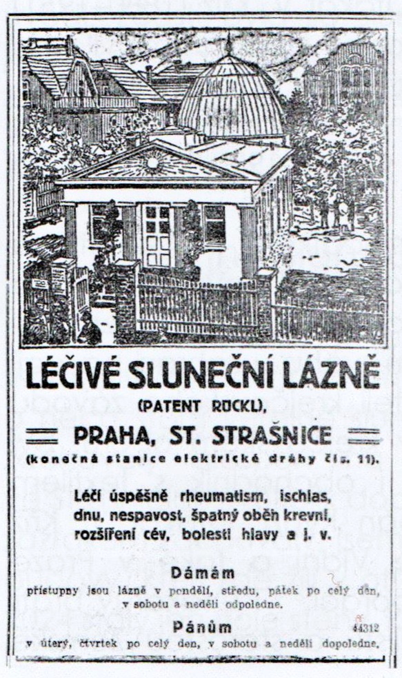 Letos jsem dostal ischias a léčil jsem se ve slunečních lázních ve Strašnicích. Nevím, je-li čtenářům známá hlavní myšlenka. Slunce je zdroj života, ale část paprsků je škodlivých. Ve Strašnicích léčí pacienty pod skleněnou kopulí. Sklo je odchylné od obyčejného skla a zrovna tyhle škodlivé paprsky nepropouští. Takové sklo … u nás … vynalezl pan Rückl…