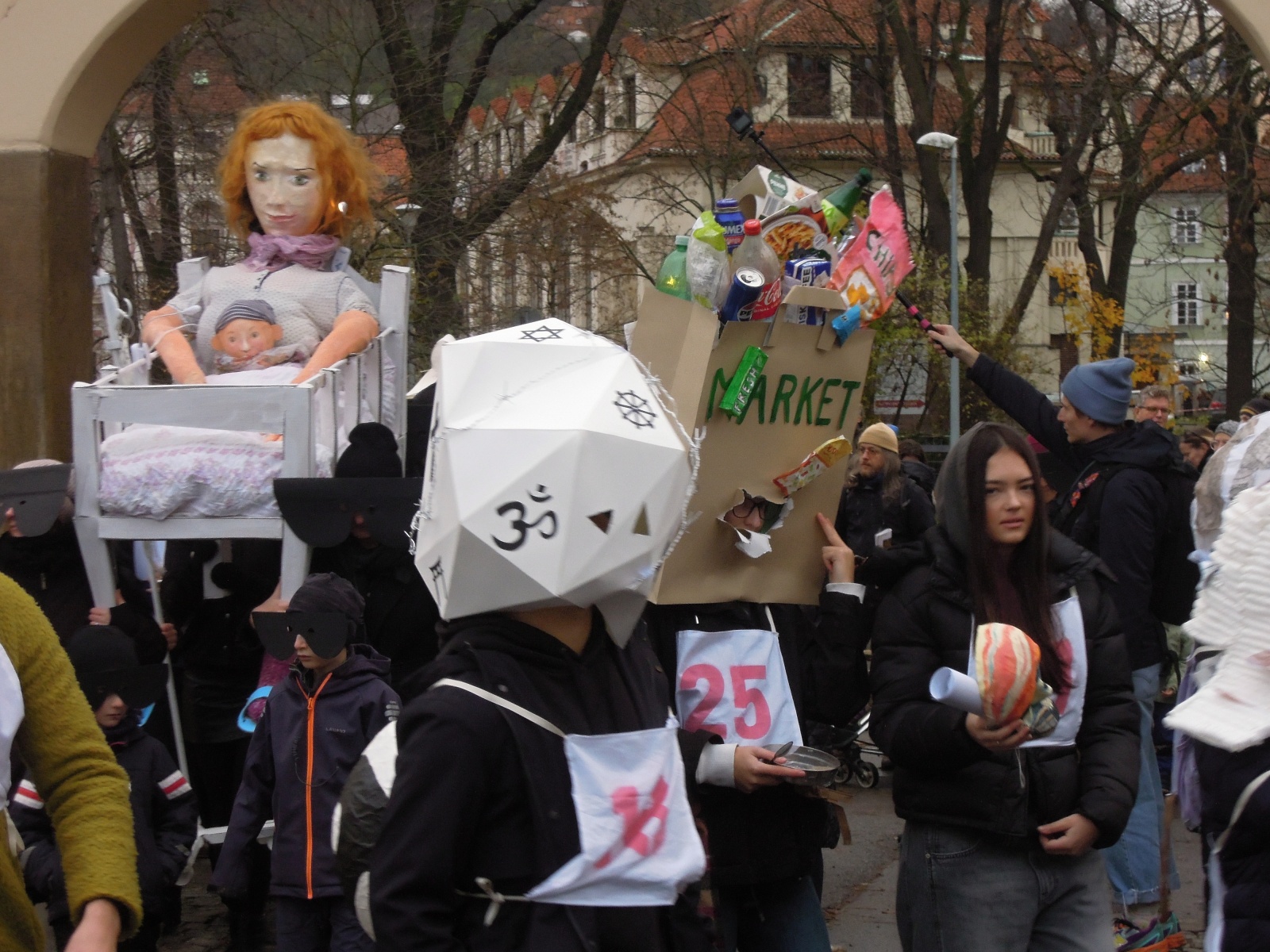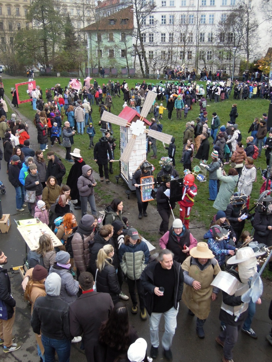 V čele průvodu kráčela monumentální želvuška, maska, která odkazovala k mikroskopickému živočichu, který přežije prakticky všechno – jaderný výbuch, extrémní sucho i jakékoli znečištění životního prostředí. V průvodu želvuška symbolizovala „věčnou entitu, obklopenou malicherností lidských sporů“.[1] Další reflexe společenských problémů obstarali například Obránci zvířat svou show „Hospodářské zvíře má talent“, podobné téma zpracovali ve vystoupení „Zvířátka mlčí, a co vy?“ studenti pražského gymnázia Livingstone, na nedostupnost bydlení pro mladé lidi nápaditě poukázali budoucí pedagogové ze škol v Evropské 33 v Praze 6, nedostatky ve zdravotní péči satiricky zpracovala Matkoskupina i Panda Art Stream, výzvy umělé inteligence svérázně pojednala severočeská klika KlaunAIáda, která podle svých slov[2] pracuje